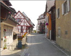 ... das hat sich in seinem Stadtbild seit Jahrhunderten wenig verändert und man spürt in seinen Gässchen noch das Flair der Beschaulichkeit jener Jahre in der Mitte des 16. Jhs., in denen Jörg Wickram, der „Tichter“ und „Stattschreiber zů Burckhaim", hier weilte. An ruhigen Tagen könnte man fast glauben, die Zeit sei stehen geblieben und Wickram komme gleich aus seiner Amtsstube im „Haus zu den fünf Türmen“ und gehe in die Torschänke, um ein Viertele Roten zu trinken.